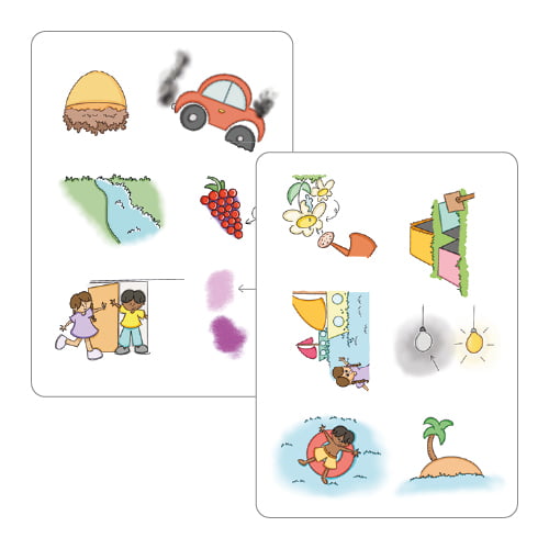 Draai elk om de beurt een kaartje om en ga op zoek naar de prent die op beide kaarten staat. Wie het eerst is, krijgt beide kaarten.